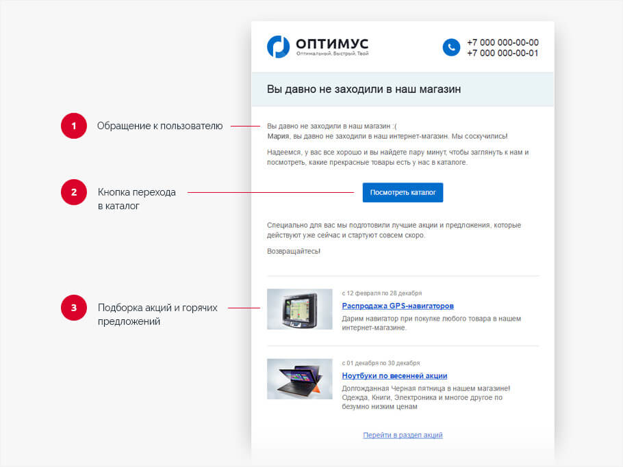 Пример: после регистрации пользователь получает серию из приветственного письма, списка акций и специальных предложений, подборки персональных рекомендаций на основе просмотренных товаров и купона со скидкой на первый заказ.